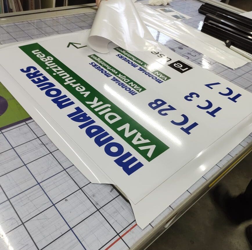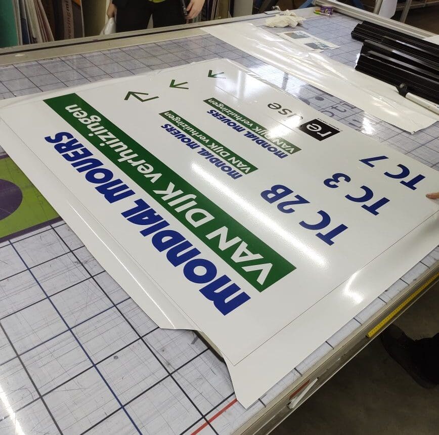 “Het makkelijkste is om de juiste partner te bellen en nieuwe borden te bestellen. Maar ons uitgangspunt is: wees goed voor het milieu. Daarom beginnen we bij de 10 R’en. Is het echt nodig om nieuwe borden te plaatsen? Of kunnen we iets maken zonder grondstoffen te verbruiken? Onze conclusie was simpel: ja, de borden zijn nodig voor klanten en leveranciers, zodat ze weten waar ze moeten zijn. Aangezien we geen borden hadden die we aan konden passen, zijn we op zoek gegaan naar (weerbestendige) producten of onderdelen die we konden hergebruiken. Die waren snel gevonden. We merken bij bedrijven dat er vaak bureaubladen overblijven vanwege een beschadiging of een verkeerde afmeting. Deze kunnen echter prima op de juiste maat gemaakt worden. Dat hebben we dus ook gedaan. Het enige dat we dan nog nodig hadden voor de bewegwijzering was een nieuwe sticker waar de benodigde informatie op staat.
